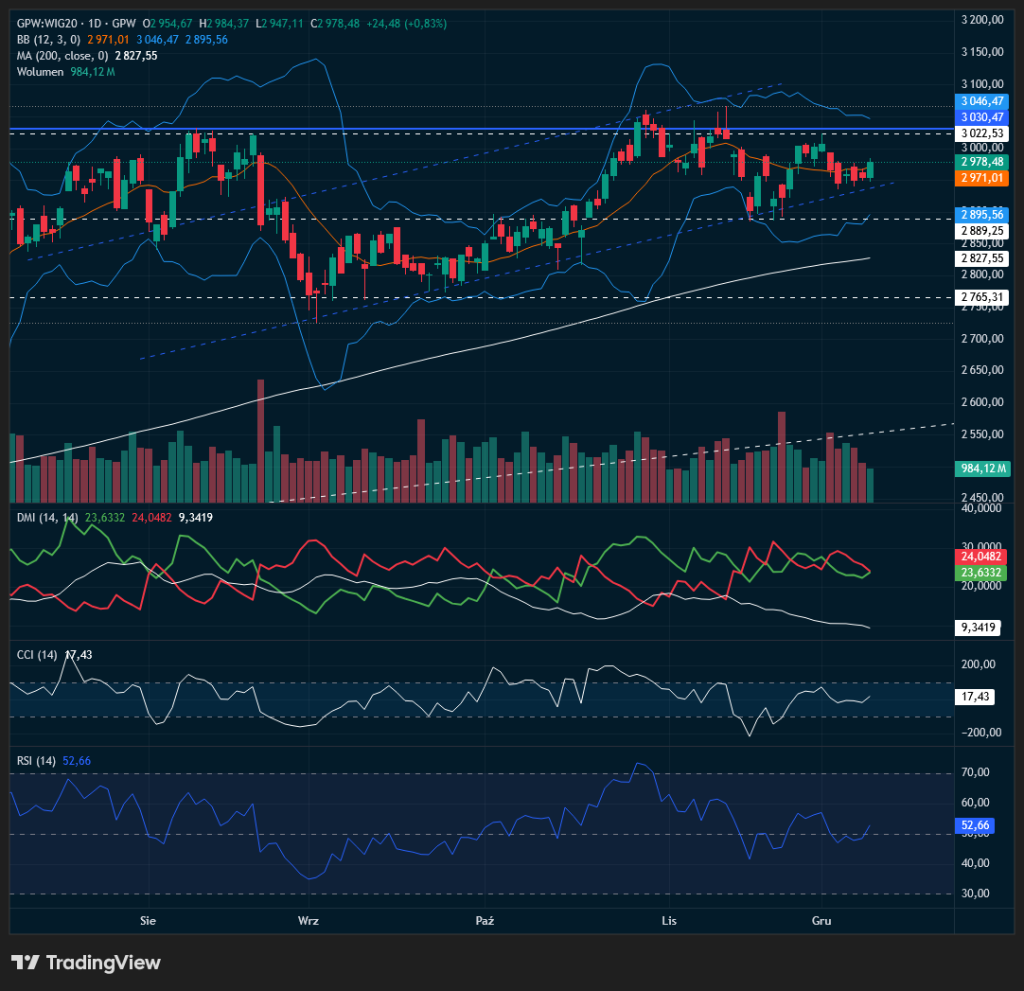 Indeks warszawskich blue chipów zyskuje przed fixingiem 0,84% i jest przy 2978 punktów, z licznikiem obrotów na poziomie 991 mln złotych. Najmocniej z Wig20 zyskują akcje CDR o 3,87% a najsłabsze walory to KGH (-1,45%). Dzisiejsza sesja przyniosła próbę wybicia Wig20 z konsolidacji 2976 – 2935 punktów, choć na początku sesji zaobserwowaliśmy pułapkę cenową wobec TL 2950 – 2955 pkt. Inwestorzy wyczekują na jutrzejszy FOMC, zwłaszcza na dot-plot i prognozy, ustawiające zakłady pod zmiany stóp procentowych w USA w Q1 / 2026 r. Pamiętajmy także, że Wig20 pozostaje w średnioterminowym układzie bocznym 3030 – 2765 pkt., aczkolwiek rosnąca SMA-200 przypomina o aktywnym momentum rynku byka.