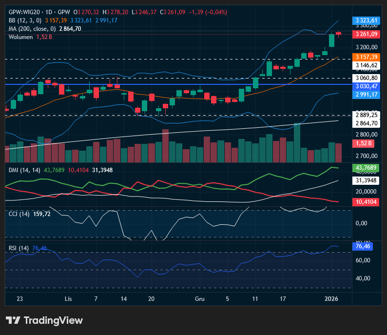 Zauważmy, że globalnie mamy ciekawy układ z +1% na DAX powyżej 24.8k przy +0,9% na NASDAQ. Na rynkach bazowych mamy klasyczny epizod „bad news is good news” a do tego manię wokół AI i Big Techów. Także wiara w Fed daje sporo do myślenia nt. potencjalnej roszady Powella w maju 2026 r. Dane pokazujące słabość przemysłu (ISM manufacturing wciąż słaby) zwiększają przekonanie, że Fed nie będzie agresywnie podnosił stóp, a raczej pozostanie łagodny lub gotowy ciąć. Do tego rynki grają w schemat, że inflacja nie „przegrzeje” gospodarki. Dla akcji – szczególnie growth/tech – to ważniejsze niż sam bieżący stan przemysłu. Na Wall St dziś liderami są półprzewodniki i szeroko pojęta technologia, ciągnięte przez boom na AI (Nvidia, Micron itd.), co dobrze widać w relacjach z pierwszych sesji 2026: chipy podbijają S&P 500 mimo mieszanych nastrojów w innych sektorach. Inwestorzy kupują narrację, że cykl technologiczny (AI, data center, chmura) jest silniejszy niż cykl przemysłowy. Do tego umocnienia na AMZN i TSLA stoją za siłą giełd zza Oceanu. Na radarach powinny być także dane z rynku pracy w USA, które odczytamy pod koniec tygodnia. Jutro mamy święto w Polsce, stąd ww. ostrożnościowe podejście jest zasadne na możliwe przesunięcia rynków bazowych.