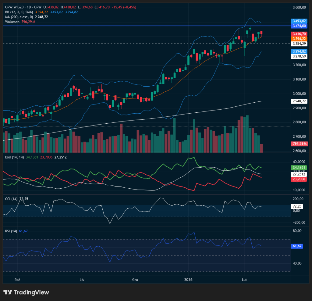 Indeks krajowych blue chipów cofa się przed zamknięciem o -0,48% i jest w rejonie 3415 pkt. (dzienne widełki ok. 3438 – 3394 pkt.), przy obrotach około 808 mln zł. Dzisiejszy handel na GPW miał charakter wyczekiwania i słabej realizacji zysków po wcześniejszej fali wzrostowej, a kierunek był wypadkową ostrożnościowo nastawionej Europy oraz nerwowości przed kluczowymi impulsami z USA. Rano globalny sentyment wspierały pozytywne sygnały z Azji (rekordowy Nikkei po zmianie politycznej w Japonii) i poprawa nastrojów w USA, gdzie znów kupowano technologię, a Dow Jones przebił 50 tys. pkt. — ale w praktyce Warszawa nie potrafiła na tym „popłynąć” dalej na północ. W Europie tłem pozostawała lekka presja podaży (DAX ok. -0,2%), co ograniczało chęć do podbijania cen akcji na GPW.