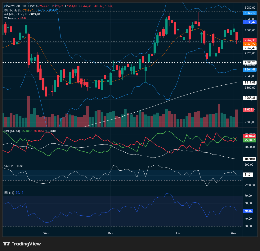 Warto zerknąć na wykres Wig20 w ujęciu dziennym, gdzie widać zadyszkę byków w ramach konsolidacji 2954 – 3023 pkt. Tym razem opór 3030 punktów jest wypadkową negatywnej dywergencji na układzie price action / RSI (14), gdyż oscylator ten nie potwierdził wybitych poziomów w fali hossy. Byki mają jednak aktywną, ważną strefę popytową przy 2962 – 2954 pkt. a także 2900 – 2889 pkt., co może wzmacniać graczy tuż przed rozliczeniem 2025 roku. Górne ograniczenie kanału Bollingera wypada przy 3062 pkt., natomiast linia ML przebiega przy ok. 2963 pkt. Wskaźnikowo rynek Wig20 czeka na impuls ilościowy do dalszych zmian, aczkolwiek DMI / ADX czy RSI / CCI (14) opowiadają się za zrównoważoną fazą handlu, przy średnim ryzyku na sesję rzędu 1,5%.