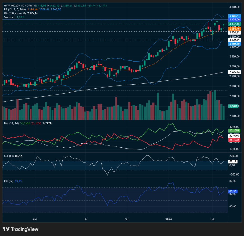 Na wykresie WIG20 widać utrzymaną przewagę popytu w średnim terminie: indeks porusza się w trendzie wzrostowym i pozostaje wyraźnie powyżej SMA-200 (ok. 2945 pkt.), co podtrzymuje byczy kontekst. Ostatnia sesja (zamknięcie ok. 3432 pkt.) domknęła się na plusie i pokazuje obronę podwyższonych poziomów po wcześniejszym schłodzeniu. Bardzo ważny TL wypada przy 3354 – 3350 pkt. a jego przebicie wiązałoby się z szerszą korektą spadkową na GPW. Jednocześnie rynek jest „rozgrzany” – kurs znajduje się wysoko w ramach wstęg Bollingera, RSI jest w rejonie ok. 64 pkt, czyli byczo, ale blisko stref, w których często pojawia się realizacja zysków. W praktyce układ wygląda tak: dopóki popyt broni strefy ok. 3384–3350 pkt., indeks ma przestrzeń do ponownego ataku na 3474–3500 pkt. Natomiast trwałe zejście poniżej tej strefy wsparcia zwiększyłoby ryzyko krótkiej korekty w kierunku niższych poziomów (okolice 3270 pkt. jako kolejny punkt odniesienia). Na dziś bazowy scenariusz jest więc prosty: rynki bazowe pokazują odporność, ale gra toczy się o dane z USA i o rentowności. Jeśli globalny sentyment utrzyma tryb „risk-on”, WIG20 może kontynuować próbę wybicia w górę. Jeśli jednak rynek stopy procentowej znów zacznie dyktować warunki, lokalnie najbardziej prawdopodobny będzie ruch schładzający w ramach byczego obrazu.