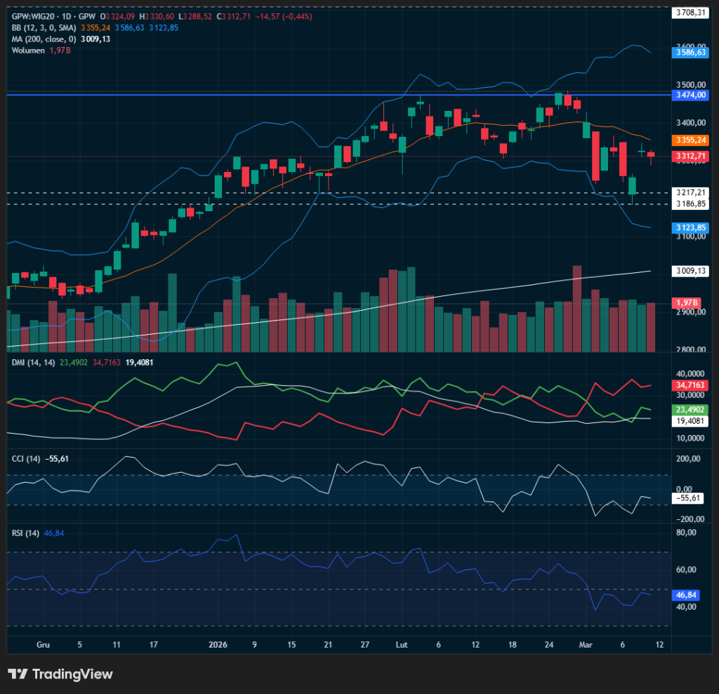Z punktu widzenia techniki, WIG20 znajduje się w trudnym położeniu. Ostatnie zamknięcie na poziomie 3312,71 pkt. (-0,44%) nastąpiło poniżej median line BB (3355 pkt.), co potwierdza przewagę niedźwiedzi. Kluczowe wsparcie zlokalizowane jest w rejonie 3217-3186 pkt. i przy obecnym sentymencie jego test wydaje się prawdopodobny. Oporem pozostaje strefa 3400-3474 pkt. Wskaźnik CCI na poziomie -55,61 pkt. oraz układ linii DMI (czerwona powyżej zielonej) sygnalizują narastającą presję podażową, a wysoki obrót (1,97 mld zł) potwierdza realną ucieczkę kapitału do bezpiecznych przystani. Spodziewamy się otwarcia WIG20 z luką spadkową, prawdopodobnie w okolicach 3280–3250 pkt. Inwestorzy będą prawdopodobnie rozważać sytuację Orlenu jako naturalnego beneficjenta drożejących surowców, unikając komponentów związanych z geopolitycznym ryzykiem. Kluczowe dla dalszego przebiegu sesji będą kolejne nagłówki dot. Bliskiego Wschodu / ropy naftowej – każdy sygnał o trwałym zablokowaniu dostaw czarnego płynnego paliwa może pogłębić wyprzedaż i skierować indeks w stronę dolnych ograniczeń ww. strefy wsparcia.