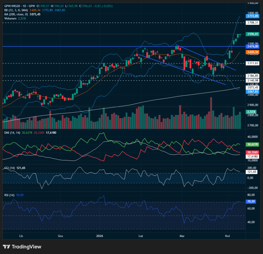 Na wykresie dziennym WIG20 zamknął się na 3596,03 pkt, praktycznie bez zmiany względem poprzedniej sesji, ale utrzymał się wyraźnie powyżej kluczowych średnich i lokalnych wsparć. Indeks pozostaje wysoko nad SMA-200 na 3073,45 pkt oraz nad środkową linią Bollingera na 3420,34 pkt, co potwierdza utrzymanie średnioterminowego trendu wzrostowego. Najbliższy techniczny opór znajduje się w rejonie 3708 pkt, a wyżej rynek wizualizuje sobie przestrzeń nawet w stronę górnego pasma Bollingera przy 3772,85 pkt. Jednocześnie trzeba pamiętać, że wskaźniki są już mocno rozgrzane: RSI wynosi 70,59, CCI 121,65, a układ DMI (+DI 30,63 wobec -DI 20,33) nadal premiuje stronę popytową, choć przy ADX 17,62 siła trendu dopiero się buduje. Krótkoterminowo scenariuszem bazowym pozostaje więc utrzymanie przewagi kupujących z możliwą próbą ataku na 3708 pkt, ale po tak dynamicznym odbiciu nie można wykluczyć chwili oddechu lub płytkiej realizacji zysków, zwłaszcza jeśli wróci nerwowość wokół geopolityki i rynku ropy.