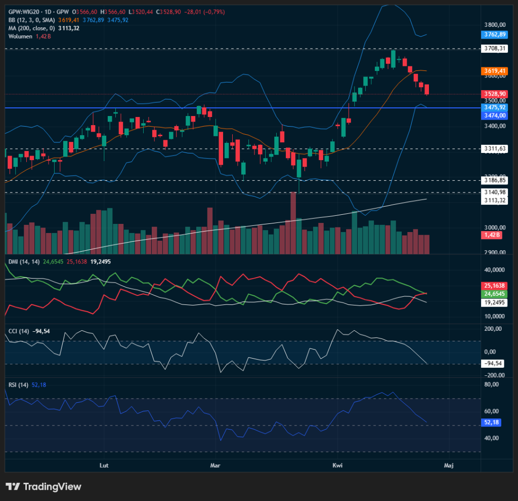 Na tym tle warszawski parkiet wykazuje oznaki technicznego zmęczenia, a WIG20 zakończył sesję spadkiem o 0,79% do 3528,9 pkt, wyraźnie cofając się spod górnego pasma Bollingera. Indeks zszedł poniżej średniej 12-sesyjnej (3619 pkt) i obecnie testuje kluczowe wsparcie w rejonie 3520–3500 pkt, które musi zostać obronione, by uniknąć głębszej przeceny w stronę 3475-3311 pkt. Wskaźnik CCI przy poziomie -94 potwierdza narastającą presję podażową, choć neutralny RSI na poziomie 52 sugeruje, że rynek ma jeszcze miejsce na bezpieczne wychłodzenie nastrojów. Obecna sytuacja to klasyczna walka dwóch sił: „vibe'u” technologicznego z USA, który obiecuje rekordowe zyski, oraz twardej geopolityki i ropy WTI przy ok. 97 USD, które przypominają o ryzykach makroekonomicznych. Inwestorzy na GPW pozostają w trybie wyczekiwania, balansując między świetnymi fundamentami spółek takich jak LPP a niepewnością przed nadchodzącymi komunikatami Donalda Trumpa i kluczową decyzją Fed.