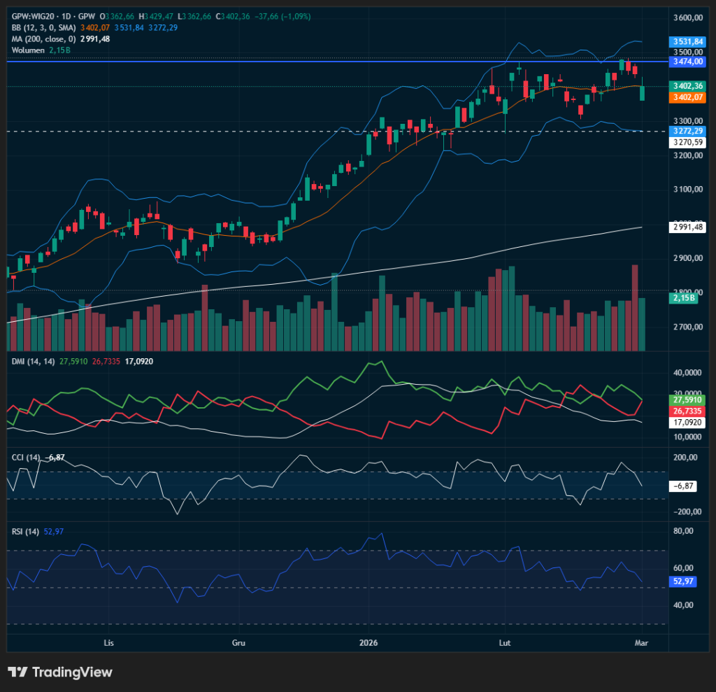 Na tym tle GPW wchodzi w dzisiejszą sesję z mieszanym, ale technicznie wciąż nieprzełamanym obrazem. WIG20 po serii korekcyjnych świec wybronił wczoraj strefę wsparcia w rejonie 3362 – 3350 pkt. i zamknął dzień wyraźnym, popytowym stłumieniem (ok. +1,2% od otwarcia i -1,1% dzień do dnia), choć odbyło się to przy skokowym wzroście wolumenu, co świadczy o nerwowej przepychance między stronami rynku. Na wykresie dziennym indeks utrzymuje się powyżej rosnącej średniej SMA 200 (ok. 2991 pkt.), a wstęgi Bollingera wciąż są skierowane lekko ku górze – obecny ruch można więc na razie odczytywać jako korektę w trwającym średnioterminowym trendzie wzrostowym, a nie jego załamanie. Sygnalna RSI(14) oscyluje w okolicach 53 pkt., daleko od strefy wykupienia, co pozostawia przestrzeń do dalszego ruchu w górę, natomiast CCI przetestował podwyższone poziomy i słabnie, sygnalizując próbę powrotu podażowego momentum. DMI pokazuje wciąż przewagę +DI nad –DI, choć różnica się skurczyła – byki wciąż trzymają inicjatywę, ale geopolityczne tło sprawia, że jest ona mocno kwestionowana.