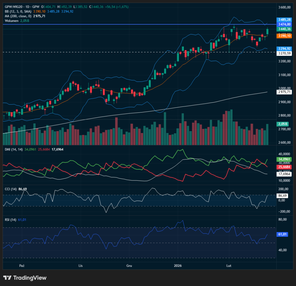 W tym otoczeniu GPW dostaje jednocześnie impuls zewnętrzny (risk-off) i wewnętrzny (techniczna struktura trendu), więc zmienność w komentarzach staje się równie ważna jak same poziomy. Wczoraj mieliśmy wyraźną siłę krajowego rynku akcji a Wig20 był jednym z najmocniejszych indeksów w Eurolandzie. Na wykresie WIG20 widać, że indeks jest w trendzie wzrostowym i zakończył sesję przy ok. 3440 pkt (+1,67%), co w dniu globalnej nerwowości jest oznaką relatywnej siły. Cena znajduje się powyżej średniej krótkoterminowej (okolice 3390 pkt.), co sugeruje, że popyt utrzymuje przewagę w rozgrywanej konsolidacji. Jednocześnie górne pasmo Bollingera wypada w rejonie ok. 3485 pkt., więc strefa 3474–3485 pkt. staje się pierwszym, naturalnym „sufitem” dla byków po dynamicznym ruchu. Jeśli ta strefa zostanie wybita i utrzymana, rynek dostaje paliwo do kontynuacji marszu w górę, ale bez tego rośnie ryzyko cofnięcia do strefy równowagi przy średniej. Od dołu kluczowe są okolice przy 3390 pkt. jako pierwsze wsparcie a niżej pasmo dolne w okolicach 3295 – 3270 punktów jako barometr, czy cofnięcie ma charakter tylko korekcyjny. Sygnalna RSI (14) ok. 61 pkt. wskazuje na przewagę byków bez wejścia w skrajne wykupienie, czyli technicznie jest jeszcze „miejsce”, ale rynek jest już na podwyższonych poziomach, wskazując +34,61% r/r. Wskaźnik trendowy DMI / ADX sugeruje przewagę trendu wzrostowego, co wspiera scenariusz kupowania spadków, dopóki nie zobaczymy wyraźnej zmiany w relacji linii. Puenta jest taka, że gdy globalnie wraca „podatek niepewności” w postaci ceł i jednocześnie trwa nerwowe pozycjonowanie pod wynik Nvidii, to WIG20 może pozostać relatywnie mocny, ale kluczowe będzie, czy byki obronią 3390 pkt. i czy starcie z 3485 pkt. zakończy się wybiciem, a nie tylko szybkim „szczytem emocji”.