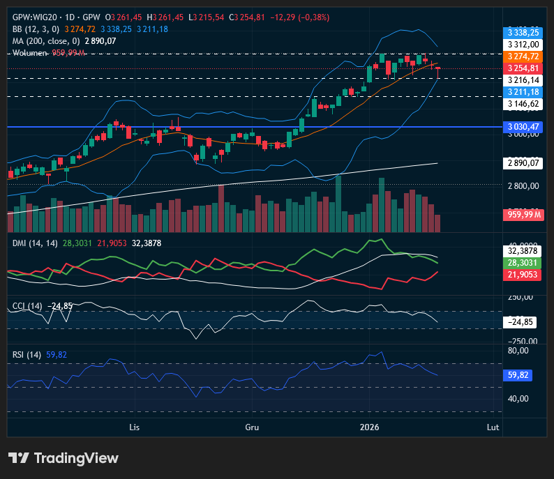 Przed finałem wtorkowej sesji Wig20 traci 0,38% z licznikiem obrotów na poziomie obniżonych 968 mln złotych. Dzisiejszym wygranym wśród blue chips są walory OPL (+2,8% i 16 mln zł obrotów). Na drugim biegunie indeksu znajdują się akcje PGE, które tracą blisko 4% przy obrotach na poziomie 30 mln zł. Groźby Trumpa wobec Europy dotyczące taryf celnych w związku z Grenlandią wzniecają na nowo obawy przed wojną handlową i wywierają presję na amerykańskiego dolara. Zauważmy, że Euroland jest wyraźnie pod presją, co muszą uwzględnić Amerykanie po powrocie na rynek po przedłużonym weekendzie. Widać także, że quasi stabilizacyjna charakterystyka krajowych, bankowych komponentów także zaważyła na inwestycyjnym klimacie przy Książęcej. W przypadku Wig20 można mówić o wstępnej obronie zakresu 3216 – 3200 punktów, stąd mamy zachowanie struktury konsolidacyjnej 3312 – 3216 pkt. Na obecną chwilę byki nie muszą się martwić potencjalnym zejściem do zakresu 3146 – 3150 pkt. Dzisiejsze budowanie Doji jest jednak trochę złudne, gdyż prowadzone przed fixingiem na zmniejszonym obrocie. Wymiany w rozliczeniu dnia mogą zatem pełnić istotną rolę. Falujące na południe sygnalne CCI – RSI nakazują włączyć ostrożność przed potencjalnym podażowym przesileniem. Warto obserwować rozwinięcia wątków sporu taryfowego czy możliwego rozstrzygnięcia dot. legalności ceł w USA.