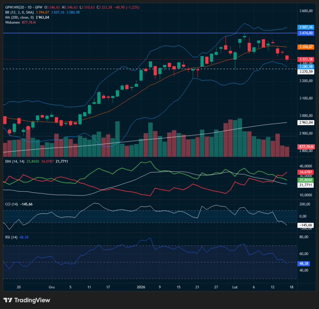 Na blisko godzinę do finału sesji Wig20 notuje -1,22% z licznikiem obrotów na poziomie lekko podbitych 896 mln złotych. Dzisiejszym wygranym, o najaktywniejszym zachowaniu wśród blue chips, jest nasza spółka dnia tj. walory PCO (+1,78% i 24 mln zł obrotów). Na drugim biegunie indeksu znajdują się akcje KGHM, które tracą 5,77% przy obrotach na poziomie 247 mln zł. Dzisiejsza relatywna słabość GPW wynika z negatywnego przełożenia sentymentu z amerykańskiego sektora technologicznego na lokalne blue-chipy oraz presji na rynki wschodzące, co przy braku krajowych impulsów popytowych spycha indeks WIG20 w stronę kluczowych poziomów wsparcia ze spojrzeniem na 3300 – 3270 pkt. Jednocześnie główne parkiety Eurolandu pozostają w fazie technicznego wyczekiwania, ograniczając zmienność do wąskich zakresów wahań, gdyż inwestorzy instytucjonalni wstrzymują się z większą alokacją kapitału przed kluczowymi publikacjami danych o PKB oraz inflacji PCE, które zdefiniują ścieżkę stóp procentowych po obu stronach Atlantyku. Technicznie patrząc mamy wybicie na południe notowań Wig20 z przedsionka 3450 – 3350 pkt. Przejście przez 3400 punktów jest tylko symboliczne, gdyż na najbliższe miesiące byki mogą stawiać zakłady odnośnie testowania 3300 – 3500 pkt., pod warunkiem zachowania średniej, miesięcznej zmienności rzędu 1,5% na sesję. Niedźwiedzie na obecną chwilę tylko przyglądają się zwyżkowej zależności na SMA-200, akceptując podtrzymaną „szeroką hossę” na GPW. Innymi słowy Wig20 kończy dzisiaj sesję poniżej lekko opadającej median line Bollingera, co świadczy o wstępowaniu zdrowej korekty spadkowej na parkiecie przy Książęcej, która tylko umiarkowanie koryguje zakres tegorocznego wzmocnienia indeksu blue chipów z GPW.