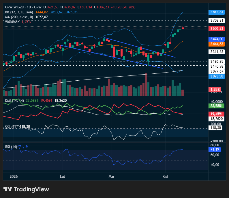 Końcówka sesji na GPW przynosi lekkie schłodzenie nastrojów, mimo że jeszcze w pierwszej części dnia indeks testował wyższe poziomy, a obecnie WIG20 cofa się w okolice 3606 pkt (+0,3%). Obroty przekraczające 1,25 mld zł przy lokalnych maksimach sugerują, że na rynku pojawiła się wstępna realizacja zysków, co po wcześniejszym dynamicznym ruchu wzrostowym zaczyna „pachnieć korektą”. Z technicznego punktu widzenia indeks pozostaje wprawdzie powyżej kluczowej strefy 3474–3445 pkt, ale wyhamowanie tuż pod oporem 3700+ pkt pokazuje, że popyt zaczyna tracić impet. Wskaźniki potwierdzają to schłodzenie – RSI na poziomie 71 pozostaje w strefie wykupienia, a CCI zaczyna zawracać, co zwiększa ryzyko krótkoterminowego cofnięcia. Jednocześnie układ DMI (+DI 33,6 vs -DI 19,5) nadal faworyzuje kupujących, choć przy ADX ok. 18 trend nie jest jeszcze silny i łatwo może przejść w konsolidację. Struktura rynku również wskazuje na mieszany obraz – mocne pozostają m.in. CD Projekt (+4,3%), KGHM (+2,3%) czy Żabka (+4,7%), ale wyraźnie ciąży Orlen (-2,6%) oraz energetyka.