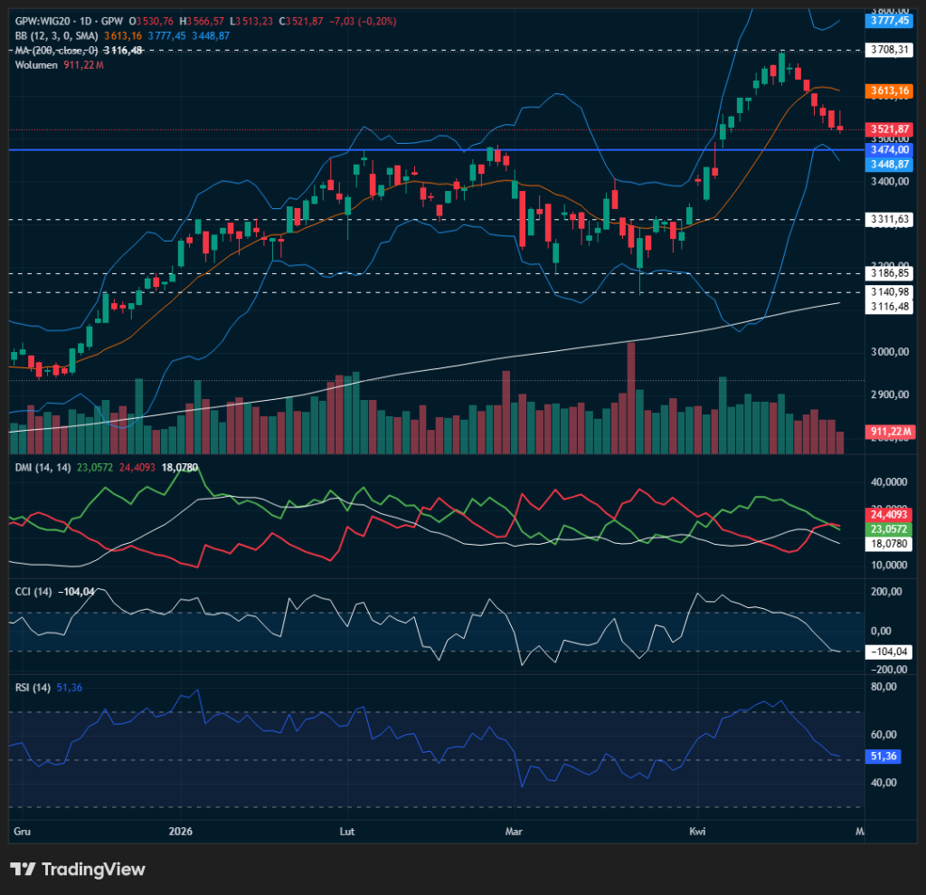 Technicznie WIG20 pozostaje w średnioterminowym trendzie wzrostowym, ale krótkoterminowo wszedł w fazę schłodzenia – indeks utrzymuje się powyżej kluczowego wsparcia 3474 pkt, jednak nie zdołał wrócić powyżej 3615 pkt (środkowa wstęga BB). RSI spadł w okolice 51 pkt, a CCI pozostaje ujemny (~ -100), co wskazuje na wygasające momentum. W ujęciu Wyckoffa rynek przeszedł z fazy markup do wczesnej dystrybucji, gdzie pojawia się podaż po silnym impulsie wzrostowym i brak kontynuacji ruchu w górę.