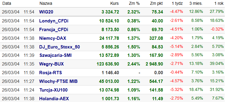 W okolicy południa GPW pozostaje w czołówce europejskich parkietów – WIG20 rośnie o ok. 2,3% do 3325 pkt., wyraźnie wyprzedzając DAX (+1,5%) i główne indeksy Eurolandu, co pokazuje, że wczorajsza kapitulacja podaży przerodziła się dziś w dynamiczne odbicie risk on. Technicznie indeks odsuwa się od dolnej wstęgi Bollingera i wraca do wnętrza wcześniejszej konsolidacji 3300–3380 pkt., redukując część sygnałów wyprzedania, ale dopiero trwałe przełamanie strefy 3380–3400 pkt. pozwoli mówić o czymś więcej niż technicznym odbiciu po szoku energetyczno geopolitycznym. W tle poprawie nastrojów sprzyja próba stabilizacji w Niemczech – po wczorajszym -3,4% dziś DAX odbija o ok. 1,5% do 24 161 pkt., wspierany przez mieszankę raportów wynikowych i nadzieję, że Marynarka Wojenna USA zdoła przynajmniej częściowo zabezpieczyć żeglugę przez Cieśninę Ormuz. Deklaracja Donalda Trumpa o eskortowaniu tankowców i gwarancjach ubezpieczeniowych dla handlu morskiego daje rynkom „oddech”, choć wciąż nie ma pewności, czy plan uda się realnie wdrożyć. Ceny ropy (+0,7%) po wcześniejszym skoku lekko się korygują od maksimów dnia, co pomaga utrzymać dzisiejszy rajd na akcjach, ale kierunek dalszej sesji na GPW i w Eurolandzie pozostanie w dużej mierze zakładnikiem napływających sygnałów z Zatoki Perskiej.