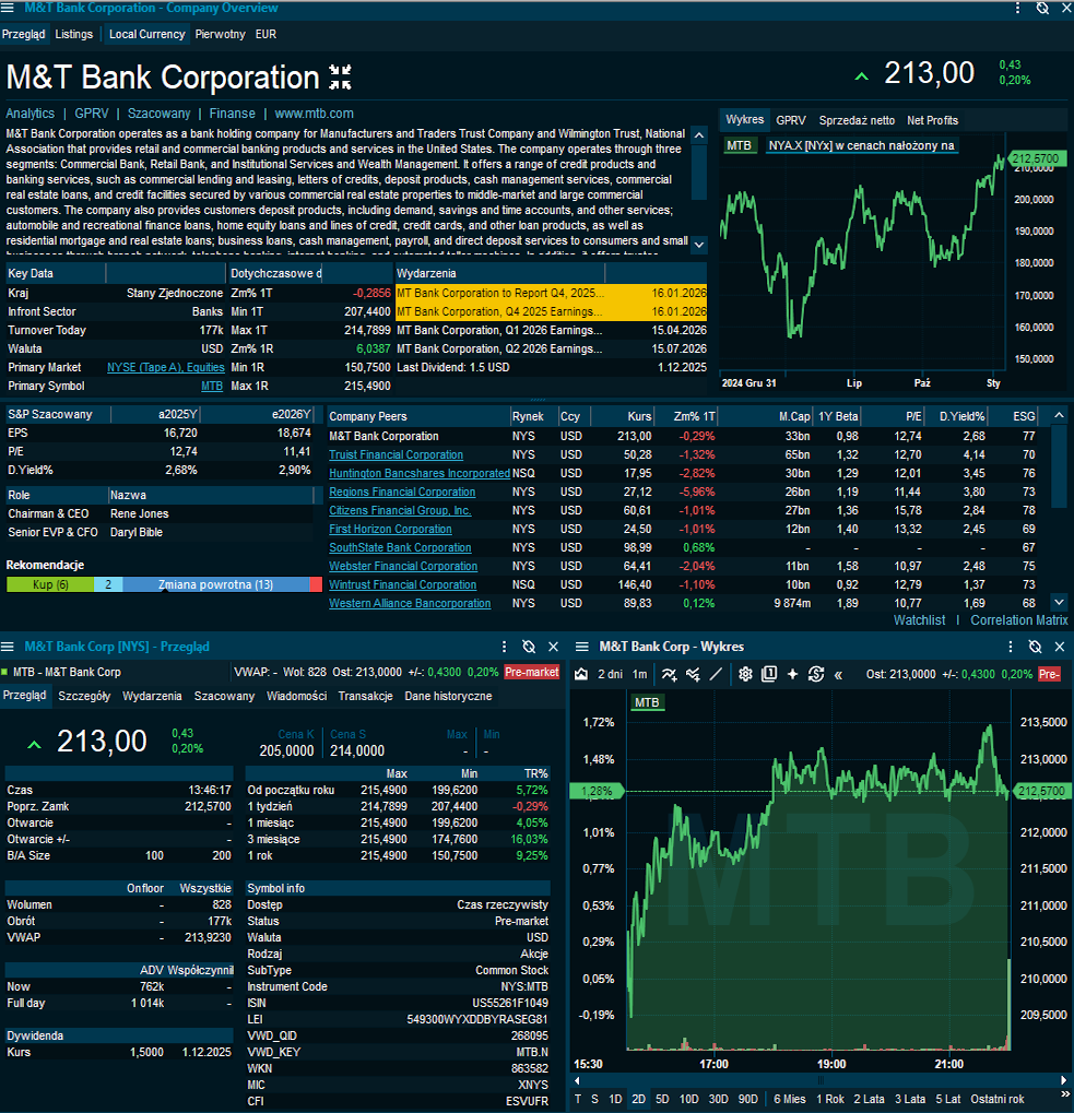 M&T Bank ($ MTB): Bank pokazał lepszy IV kwartał dzięki wyższym dochodom odsetkowym i poprawie w hipotekach. NII +~3% r/r do 1,78 mld USD, a marża odsetkowa netto wzrosła do 3,69% z 3,58%. Spółka celuje w NII 7,2–7,35 mld USD w 2026 r., co rynek czyta jako sygnał stabilizacji rentowności w środowisku „po obniżkach”. Rezerwy na straty kredytowe spadły do 125 mln USD (ze 140 mln $). To jeden z tych raportów, który daje sektorowi bankowemu argument „fundamenty trzymają”. / Reuters