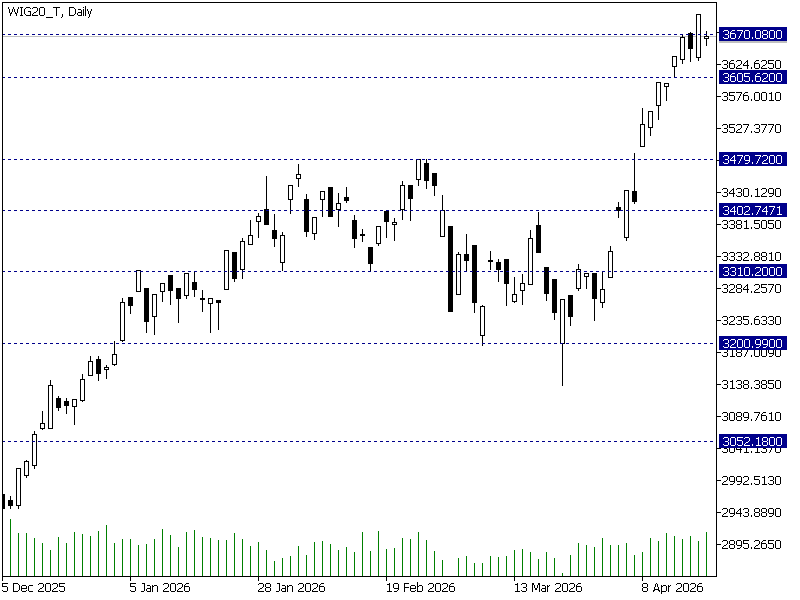 WIG20 pozostaje w silnym trendzie wzrostowym po dynamicznym ruchu z rejonu 3480 pkt. W krótkim terminie widoczna jest stabilizacja notowań powyżej 3600 pkt., co może wskazywać na budowanie bazy pod dalszy ruch. Obecnie indeks testuje lokalny opór w okolicach 3670 pkt., a jego wybicie mogłoby stanowić impuls do kontynuacji trendu i podejścia pod nowe maksima.