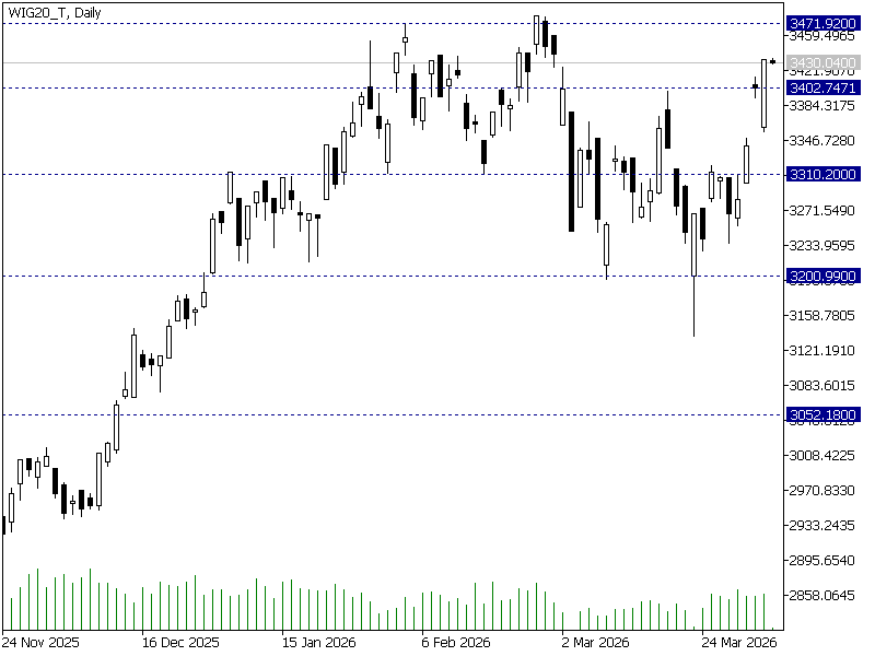 Po pierwszej godzinie handlu WIG20 wychodzi na niewielki plus (0,14%), co oznacza poprawę względem słabszego otwarcia. Do wzrostów dołącza PKO BP (+0,21%), a głównym wsparciem dla indeksu pozostają PKN Orlen (+1,21%) oraz Dino (+0,27%), które przy najwyższych obrotach nadają ton notowaniom. Jednocześnie zwyżka jest ograniczana przez spadki PZU (-0,64%) i KGHM (-0,25%). Głównym czynnikiem dla rynku pozostaje rozwój sytuacji na Bliskim Wschodzie, szczególnie w kontekście terminu wyznaczonego przez Donalda Trumpa dla Iranu.
