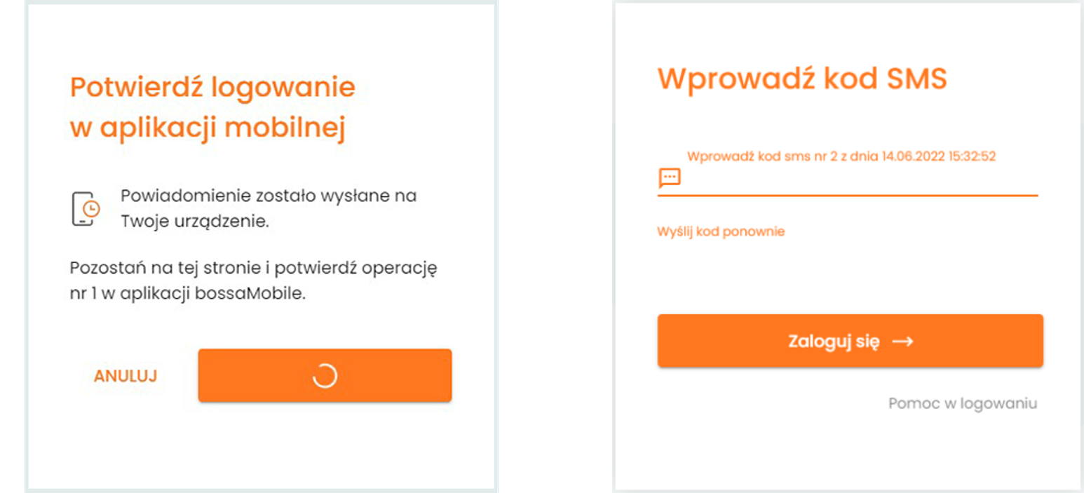 Następnie należy potwierdzić logowanie w aplikacji bossaMobile albo wpisać kod SMS lub kod tokenu do logowania.